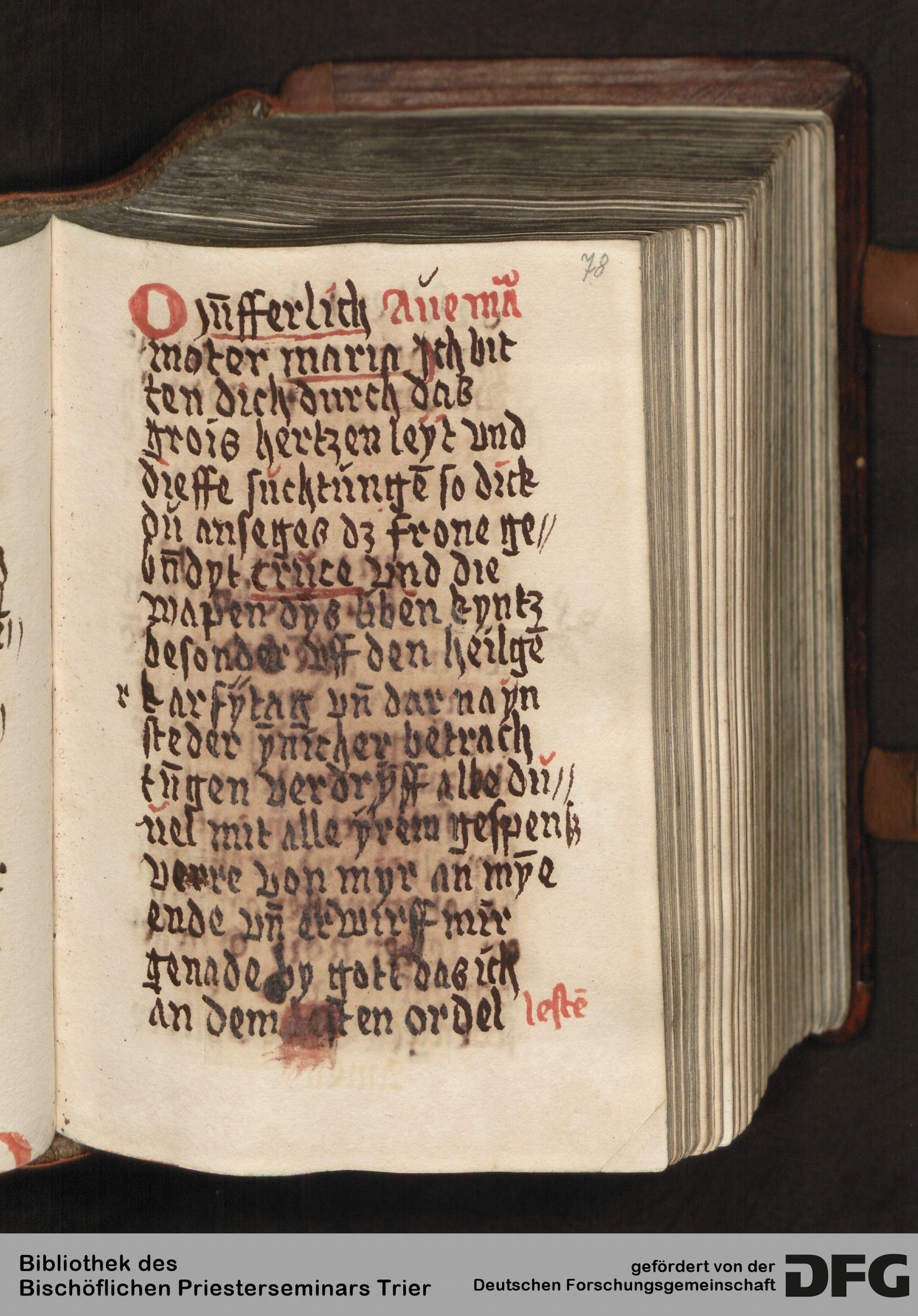 TextGrid Repository (2017). Bibliothek des Bischöflichen Priesterseminars, Hs. 111: Sammelhandschrift. Inhalte. Bibliothek des Bischöflichen Priesterseminars Trier Hs. 111. Gebete in deutscher Sprache. Blatt 78r. Blatt 78r. Virtuelles Skriptorium St. Matthias. Bibliothek des Bischöflichen Priesterseminars Trier. https://hdl.handle.net/11378/0000-0006-FBE7-B