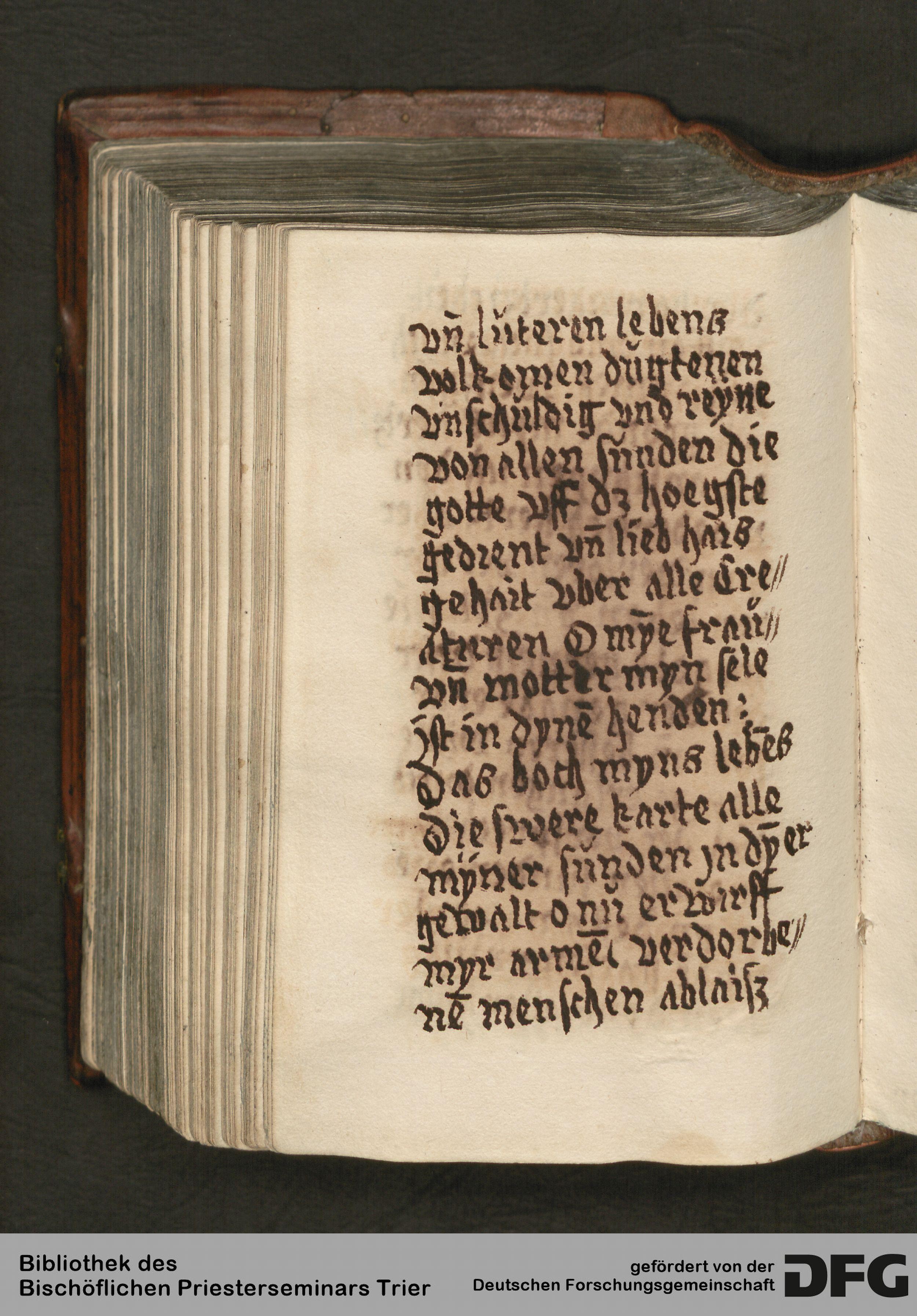 - TextGrid Repository (2017). Bibliothek des Bischöflichen Priesterseminars, Hs. 111: Sammelhandschrift. Inhalte. Bibliothek des Bischöflichen Priesterseminars Trier Hs. 111. Gebete in deutscher Sprache. Blatt 209v. Blatt 209v. Virtuelles Skriptorium St. Matthias. Bibliothek des Bischöflichen Priesterseminars Trier. https://hdl.handle.net/11378/0000-0006-FDF5-9