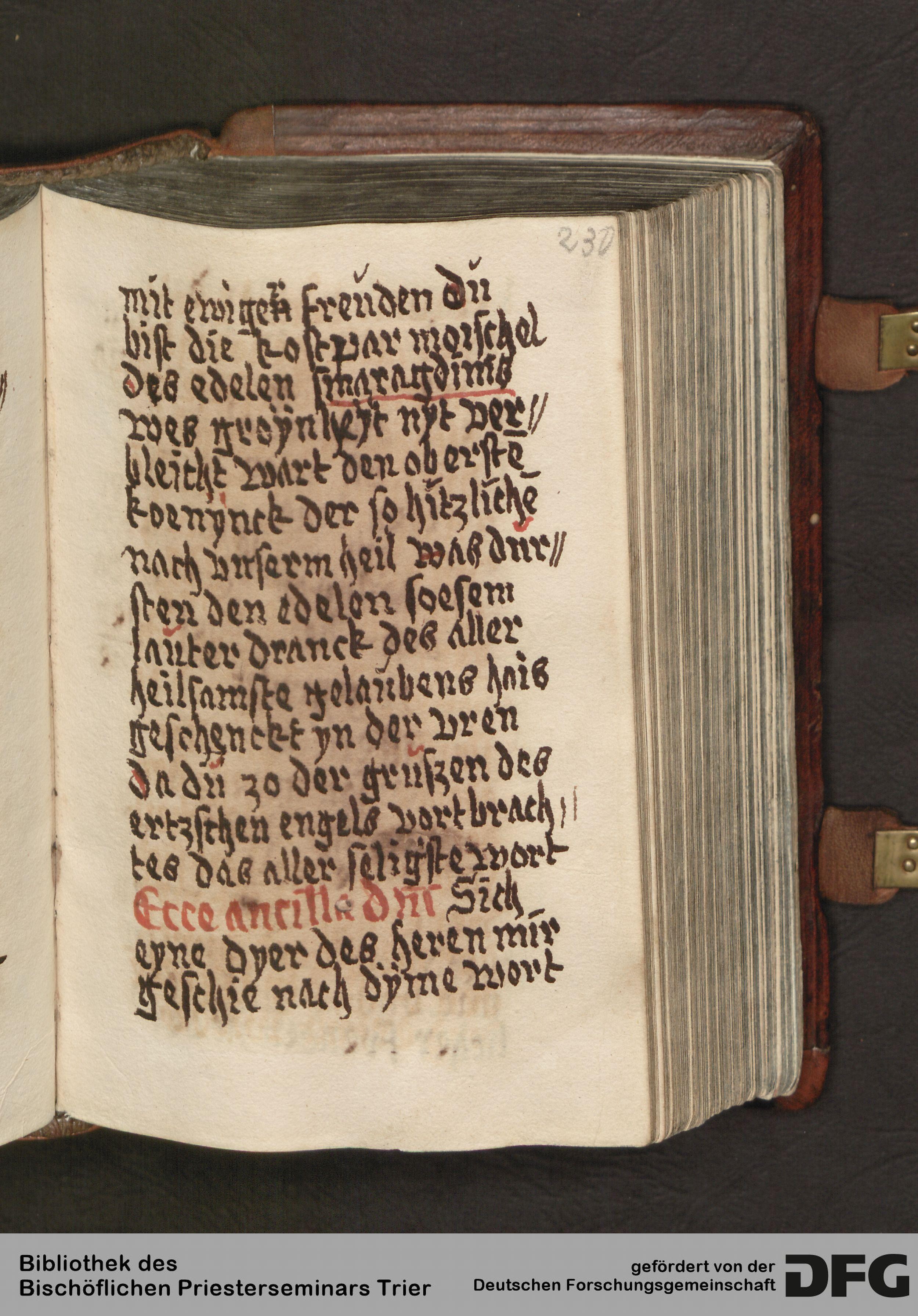 - TextGrid Repository (2017). Bibliothek des Bischöflichen Priesterseminars, Hs. 111: Sammelhandschrift. Inhalte. Bibliothek des Bischöflichen Priesterseminars Trier Hs. 111. Gebete in deutscher Sprache. Blatt 231r. Blatt 231r. Virtuelles Skriptorium St. Matthias. Bibliothek des Bischöflichen Priesterseminars Trier. https://hdl.handle.net/11378/0000-0006-FE4B-9