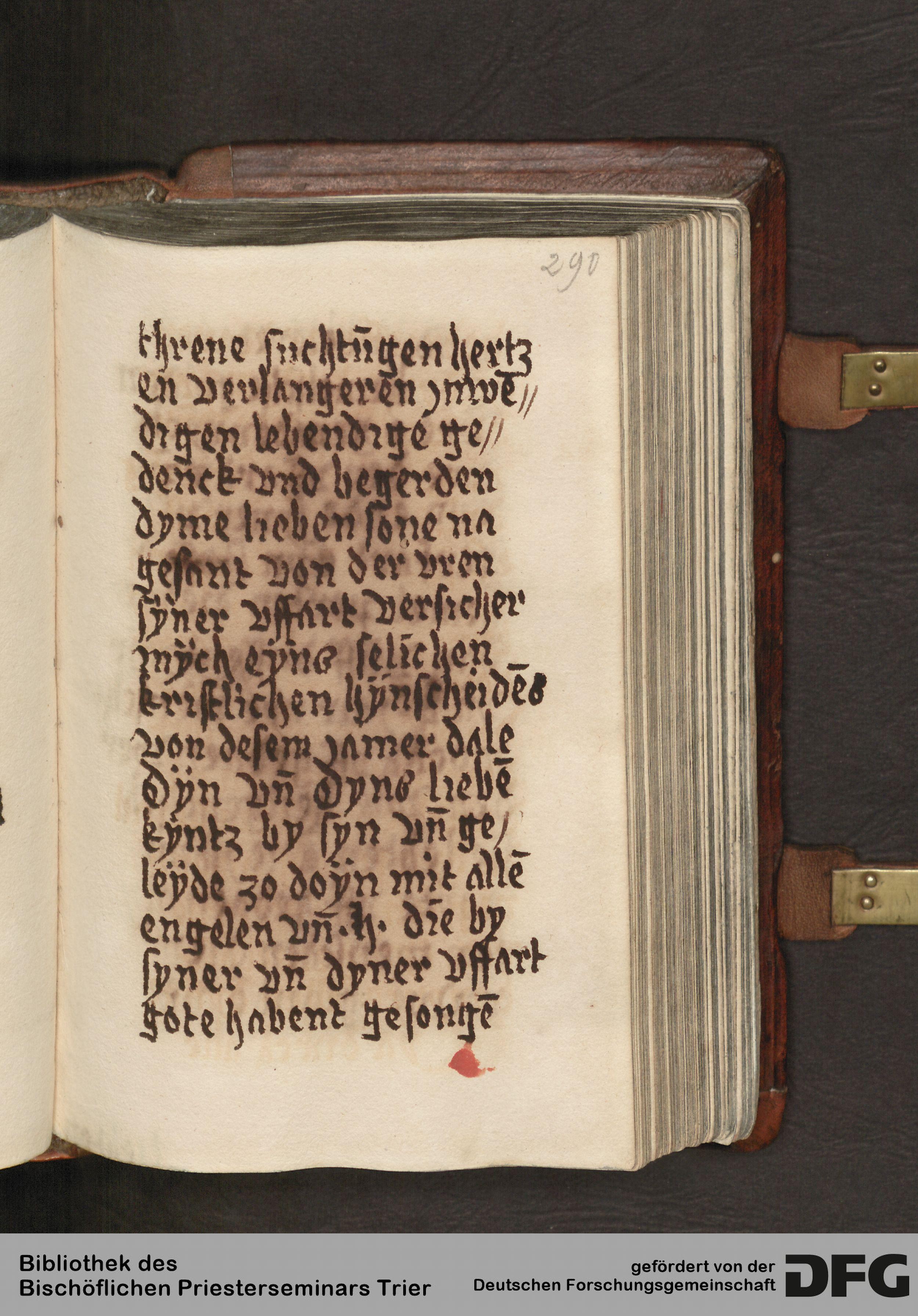 - TextGrid Repository (2017). Bibliothek des Bischöflichen Priesterseminars, Hs. 111: Sammelhandschrift. Inhalte. Bibliothek des Bischöflichen Priesterseminars Trier Hs. 111. Gebete in deutscher Sprache. Blatt 291r. Blatt 291r. Virtuelles Skriptorium St. Matthias. Bibliothek des Bischöflichen Priesterseminars Trier. https://hdl.handle.net/11378/0000-0006-FF3B-A