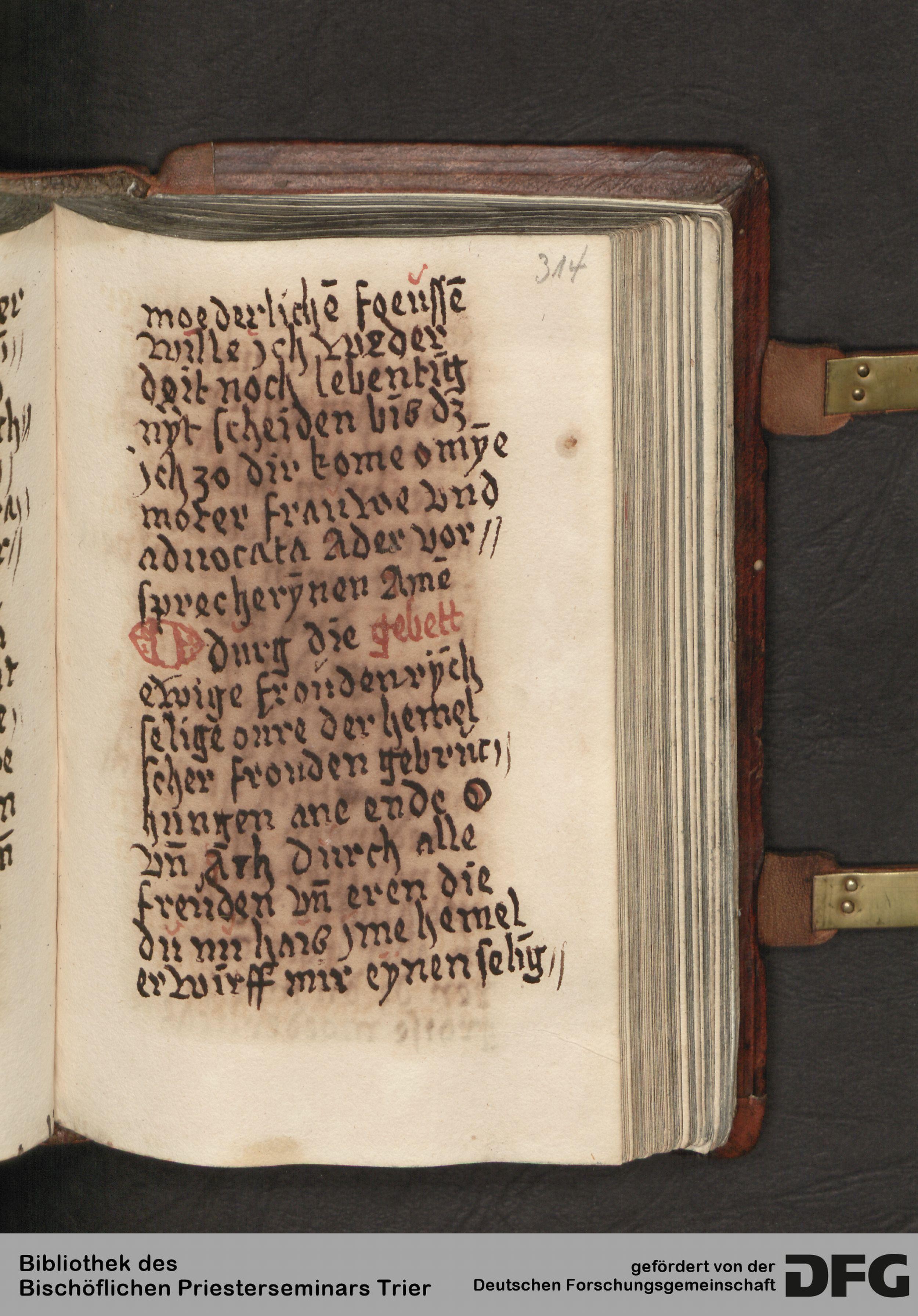 TextGrid Repository (2017). Bibliothek des Bischöflichen Priesterseminars, Hs. 111: Sammelhandschrift. Inhalte. Bibliothek des Bischöflichen Priesterseminars Trier Hs. 111. Gebete in deutscher Sprache. Blatt 315r. Blatt 315r. Virtuelles Skriptorium St. Matthias. Bibliothek des Bischöflichen Priesterseminars Trier. https://hdl.handle.net/11378/0000-0006-FF9B-D