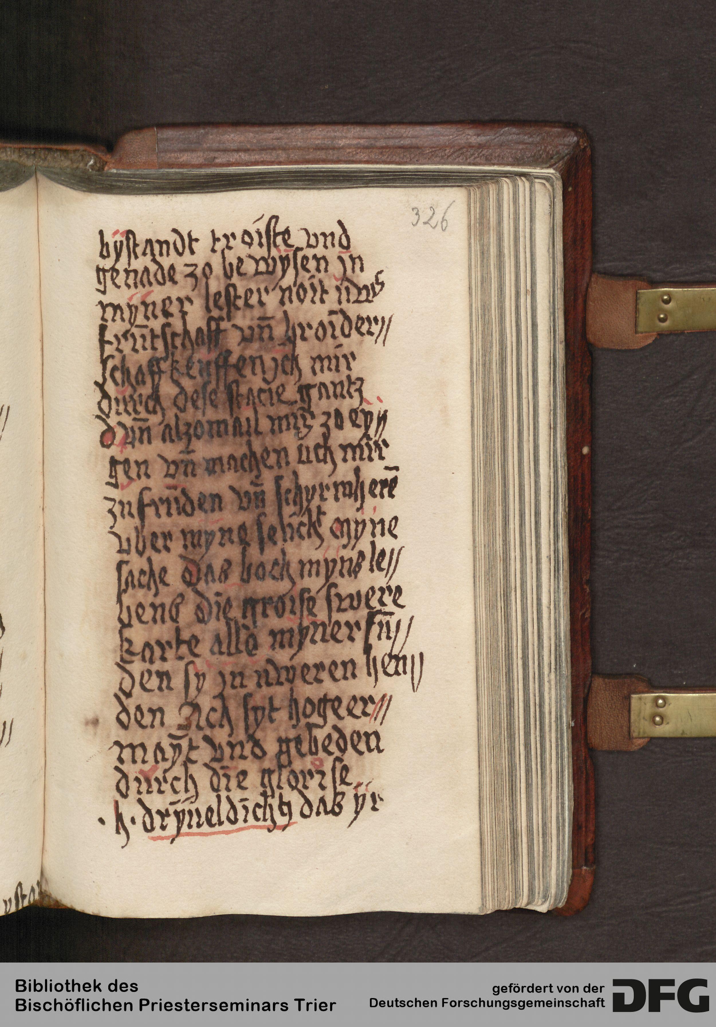 TextGrid Repository (2017). Bibliothek des Bischöflichen Priesterseminars, Hs. 111: Sammelhandschrift. Inhalte. Bibliothek des Bischöflichen Priesterseminars Trier Hs. 111. Gebete in deutscher Sprache. Blatt 327r. Blatt 327r. Virtuelles Skriptorium St. Matthias. Bibliothek des Bischöflichen Priesterseminars Trier. https://hdl.handle.net/11378/0000-0006-FFCB-7