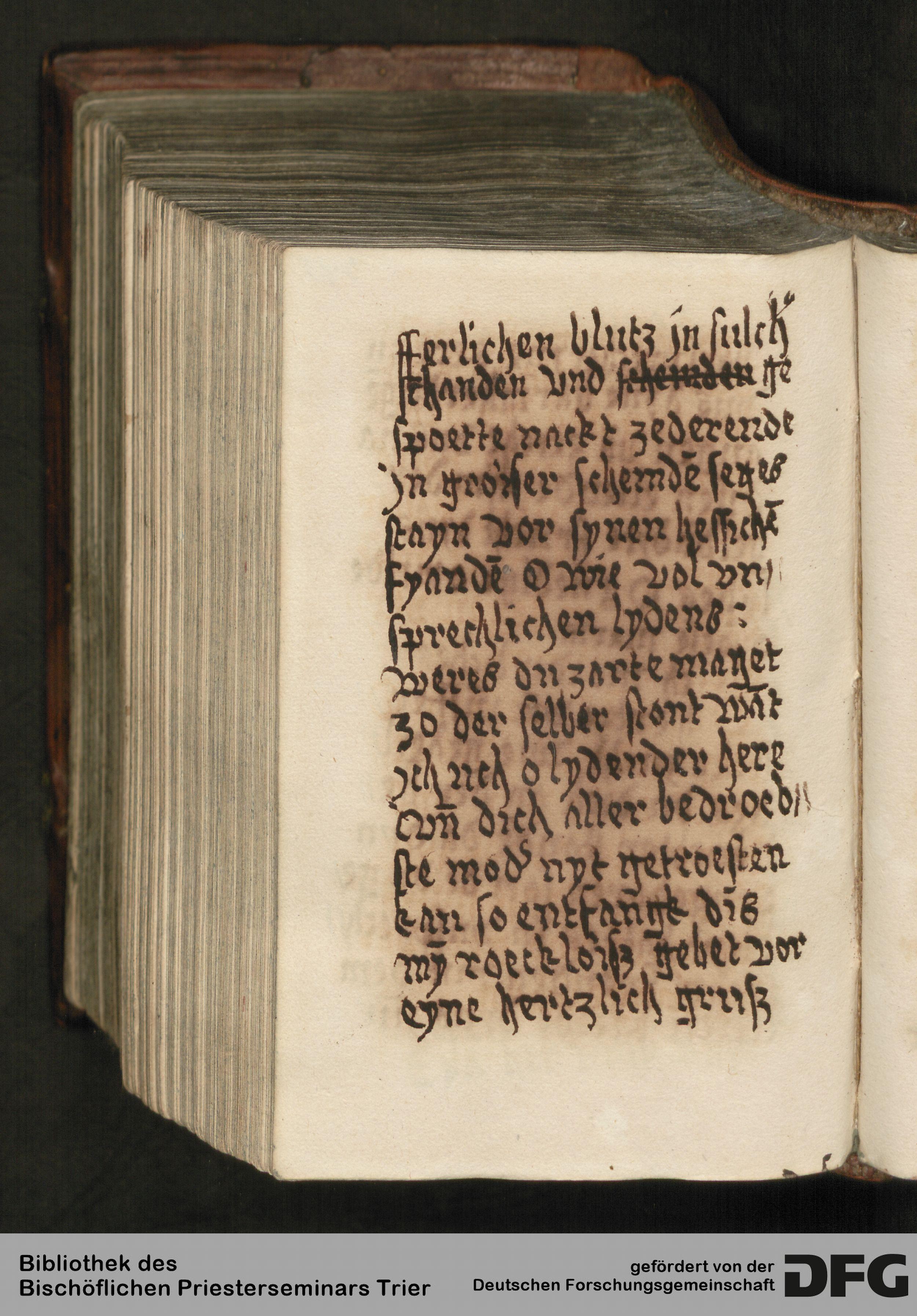 - TextGrid Repository (2017). Bibliothek des Bischöflichen Priesterseminars, Hs. 111: Sammelhandschrift. Inhalte. Bibliothek des Bischöflichen Priesterseminars Trier Hs. 111. Gebete in deutscher Sprache. Blatt 346v. Blatt 346v. Virtuelles Skriptorium St. Matthias. Bibliothek des Bischöflichen Priesterseminars Trier. https://hdl.handle.net/11378/0000-0007-0019-D