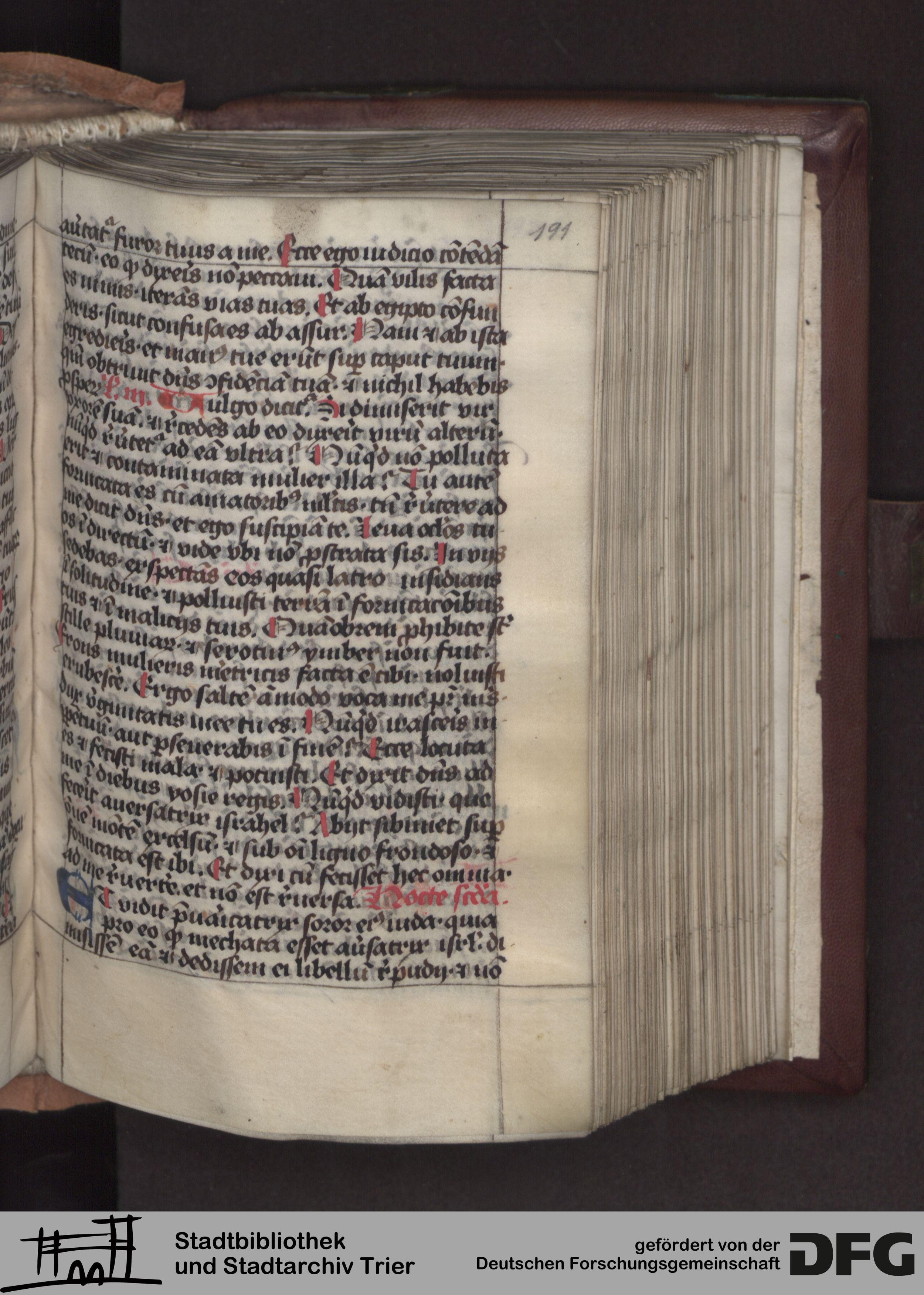 - TextGrid Repository (2017). Stadtbibliothek und Stadtarchiv Trier, Hs. 380/1049 8°: Sammelhandschrift. Inhalte. Stadtbibliothek und Stadtarchiv Trier Hs. 380/1049 8°. Brevier, Winterteil. Lektionen. Blatt 191r. Blatt 191r. Virtuelles Skriptorium St. Matthias. Stadtbibliothek und Stadtarchiv Trier. https://hdl.handle.net/11378/0000-0008-AF80-2
