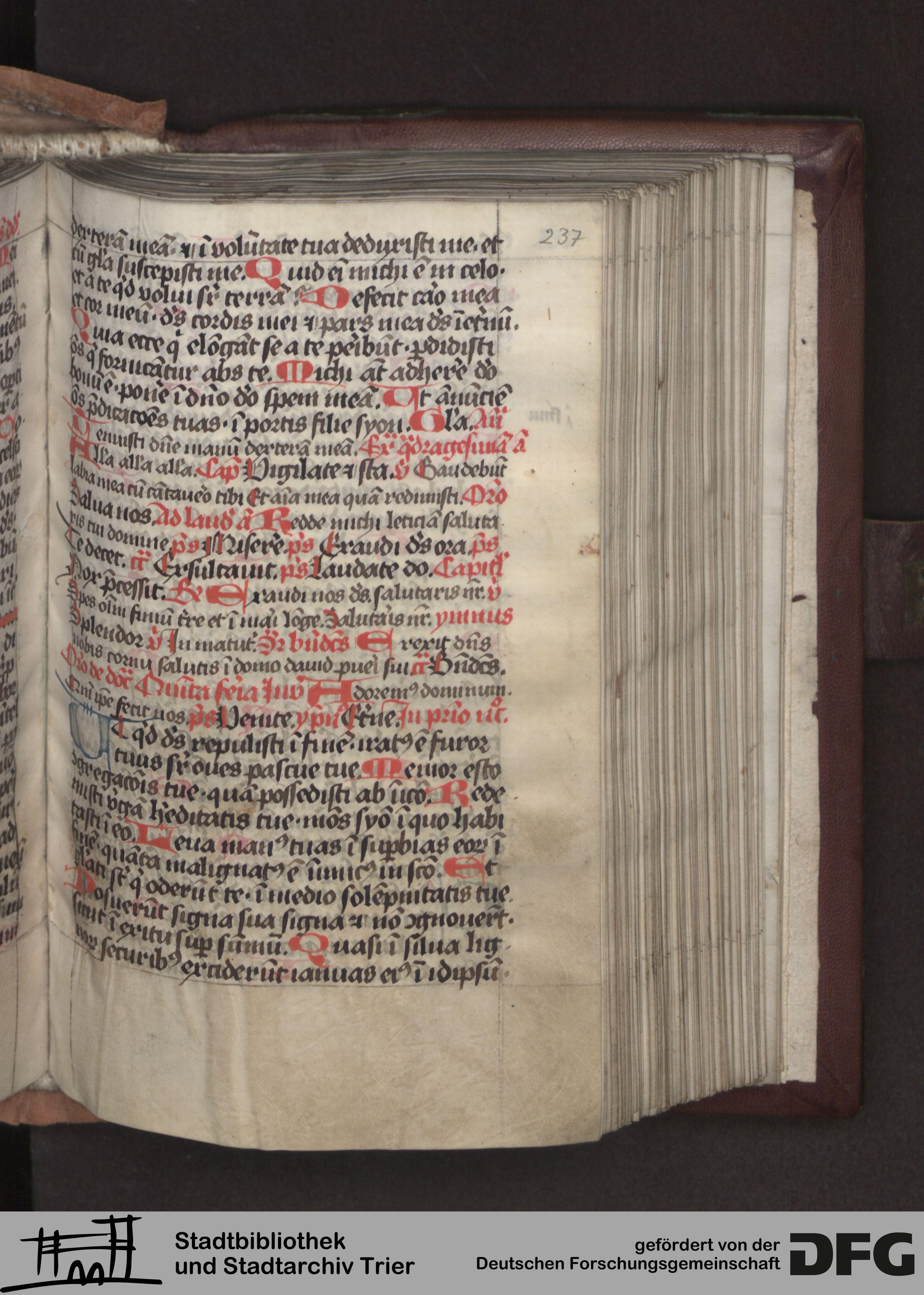- TextGrid Repository (2017). Stadtbibliothek und Stadtarchiv Trier, Hs. 380/1049 8°: Sammelhandschrift. Inhalte. Stadtbibliothek und Stadtarchiv Trier Hs. 380/1049 8°. Brevier, Winterteil. Psalterium mit Zubehör. Blatt 237r. Blatt 237r. Virtuelles Skriptorium St. Matthias. Stadtbibliothek und Stadtarchiv Trier. https://hdl.handle.net/11378/0000-0008-B038-2