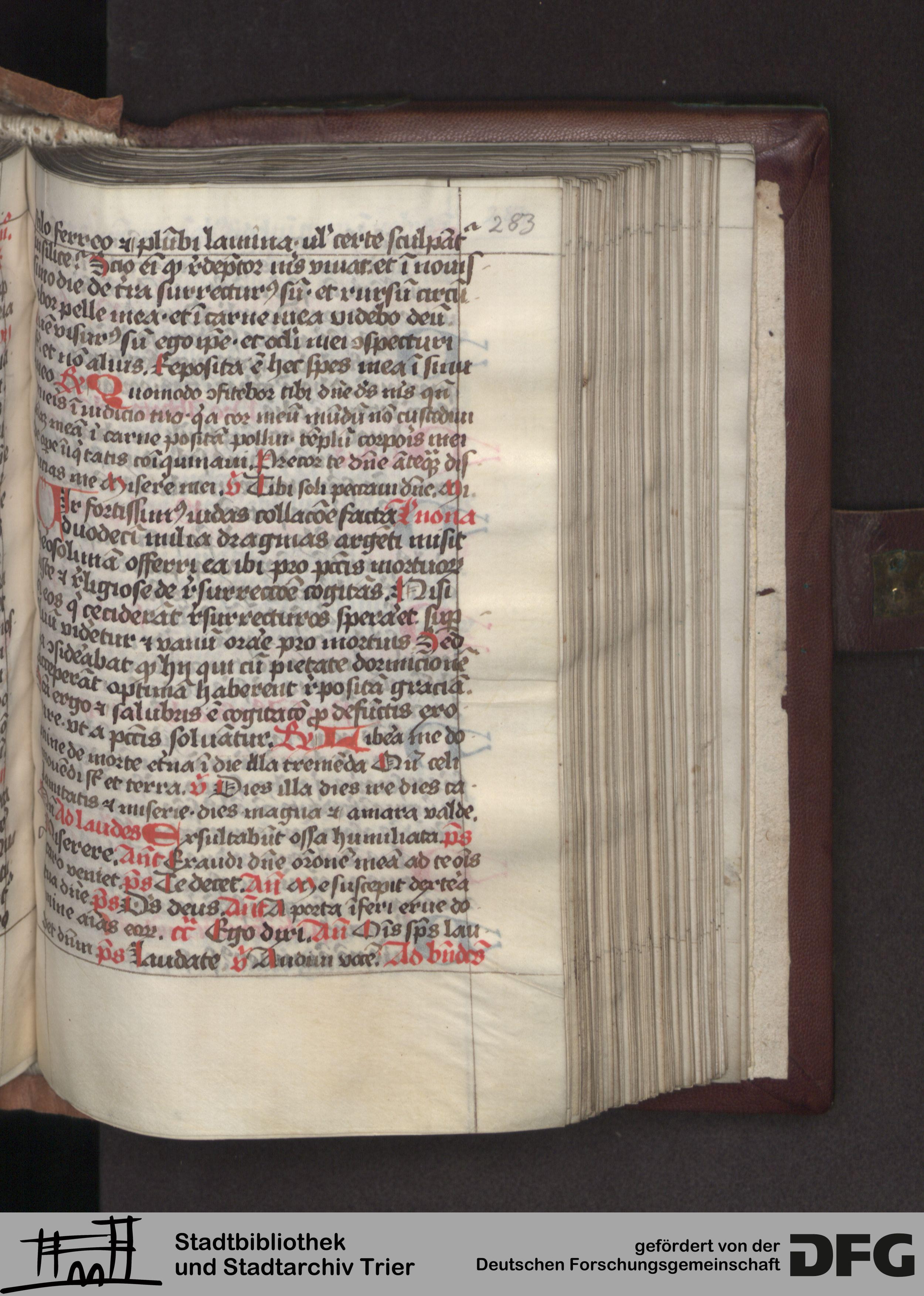 TextGrid Repository (2017). Stadtbibliothek und Stadtarchiv Trier, Hs. 380/1049 8°: Sammelhandschrift. Inhalte. Stadtbibliothek und Stadtarchiv Trier Hs. 380/1049 8°. Brevier, Winterteil. Psalterium mit Zubehör. Blatt 283r. Blatt 283r. Virtuelles Skriptorium St. Matthias. Stadtbibliothek und Stadtarchiv Trier. https://hdl.handle.net/11378/0000-0008-B0F0-1