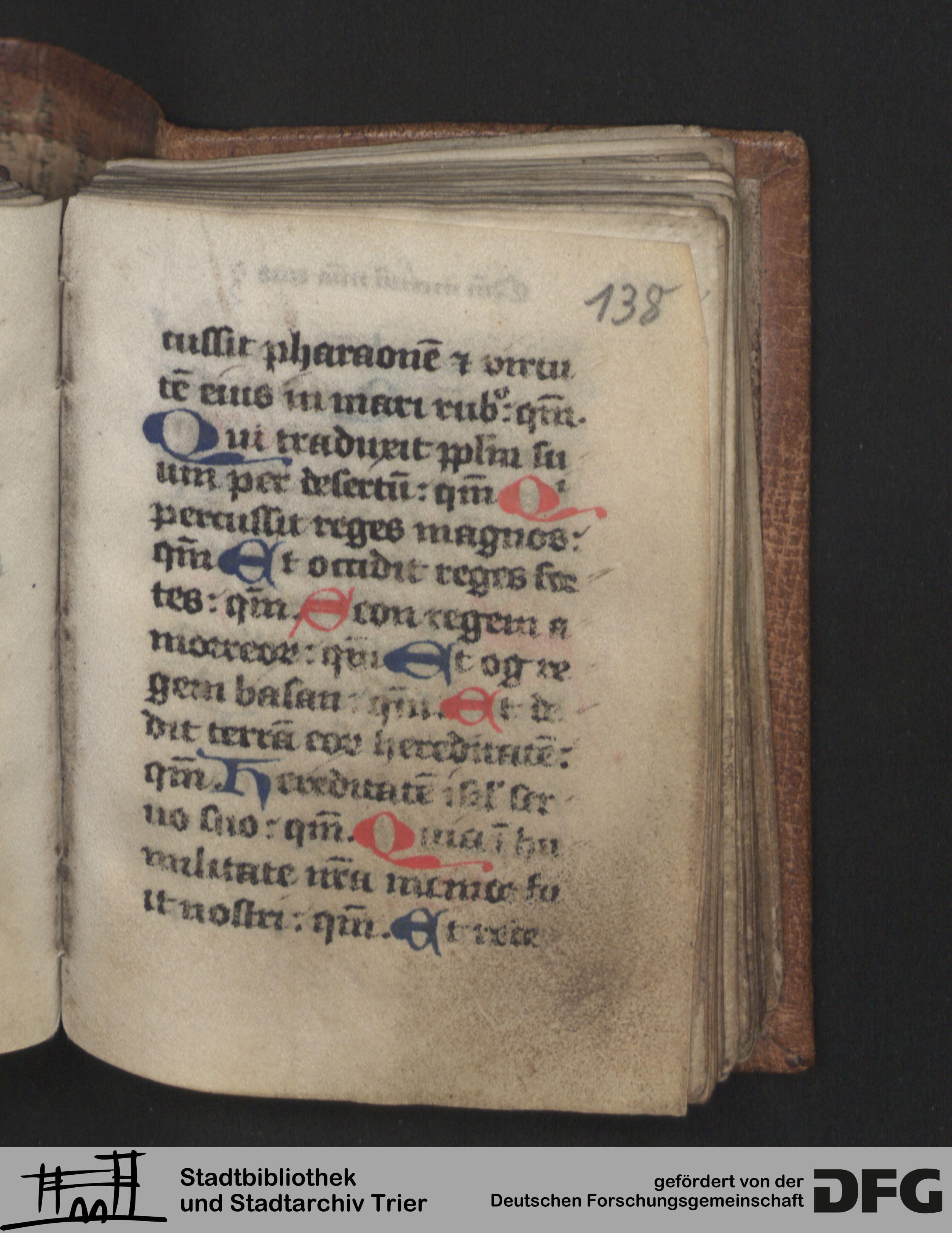 - TextGrid Repository (2017). Stadtbibliothek und Stadtarchiv Trier, Hs. 447/1612 8°: Sammelhandschrift. Inhalte. Stadtbibliothek und Stadtarchiv Trier Hs. 447/1612 8°. Psalmi ad vesperas, dominicis et feriatis diebus. Blatt 138r. Blatt 138r. Virtuelles Skriptorium St. Matthias. Stadtbibliothek und Stadtarchiv Trier. https://hdl.handle.net/11378/0000-0008-DF8D-F