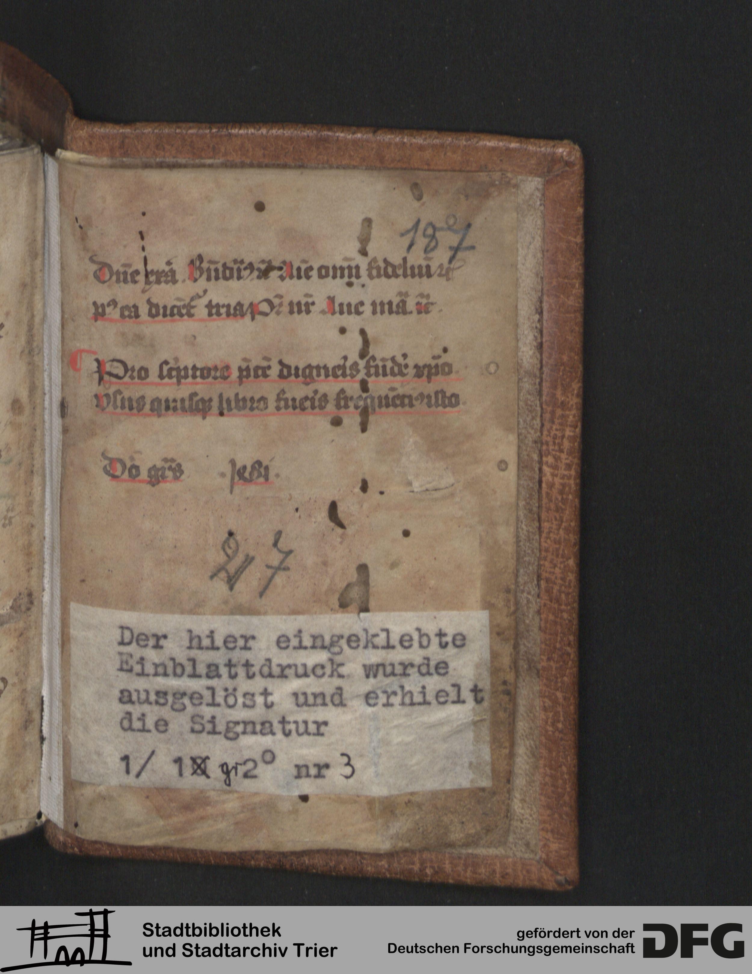 - TextGrid Repository (2017). Stadtbibliothek und Stadtarchiv Trier, Hs. 447/1612 8°: Sammelhandschrift. Inhalte. Stadtbibliothek und Stadtarchiv Trier Hs. 447/1612 8°. Completorium beate Marie virginis. Blatt 187r. Blatt 187r. Virtuelles Skriptorium St. Matthias. Stadtbibliothek und Stadtarchiv Trier. https://hdl.handle.net/11378/0000-0008-E051-F