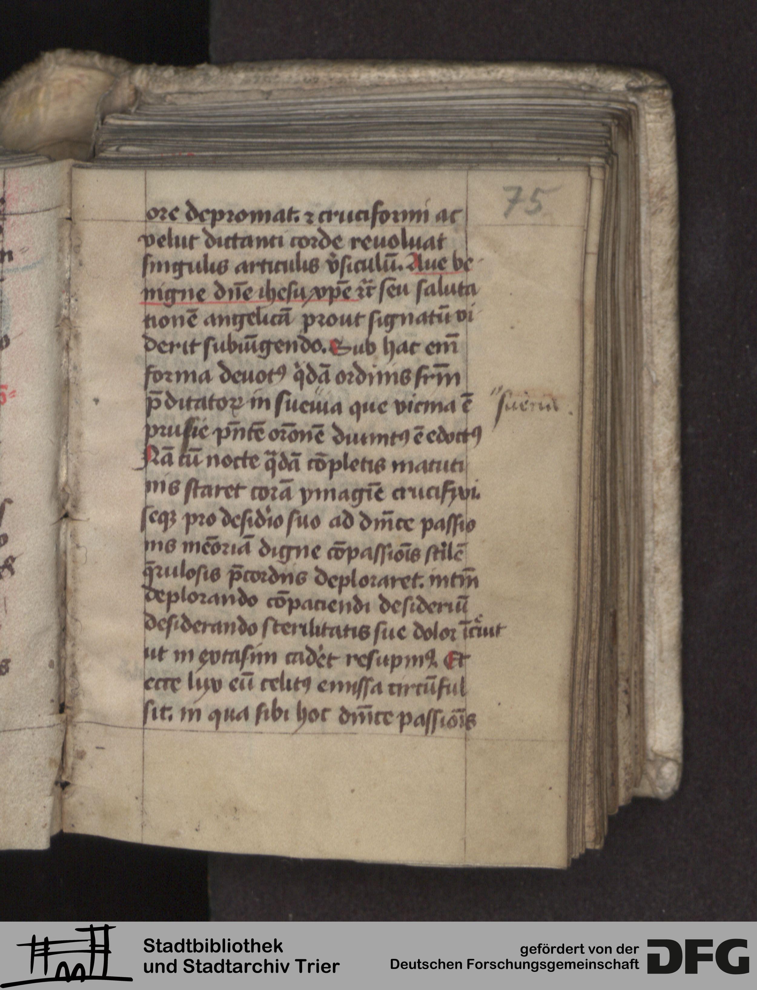 - TextGrid Repository (2017). Stadtbibliothek und Stadtarchiv Trier, Hs. 496/1599 8°: Sammelhandschrift. Inhalte. Stadtbibliothek und Stadtarchiv Trier Hs 496/1599 8°. Centum meditationes de passione. Blatt 75r. Blatt 75r. Virtuelles Skriptorium St. Matthias. Stadtbibliothek und Stadtarchiv Trier. https://hdl.handle.net/11378/0000-0009-105D-D