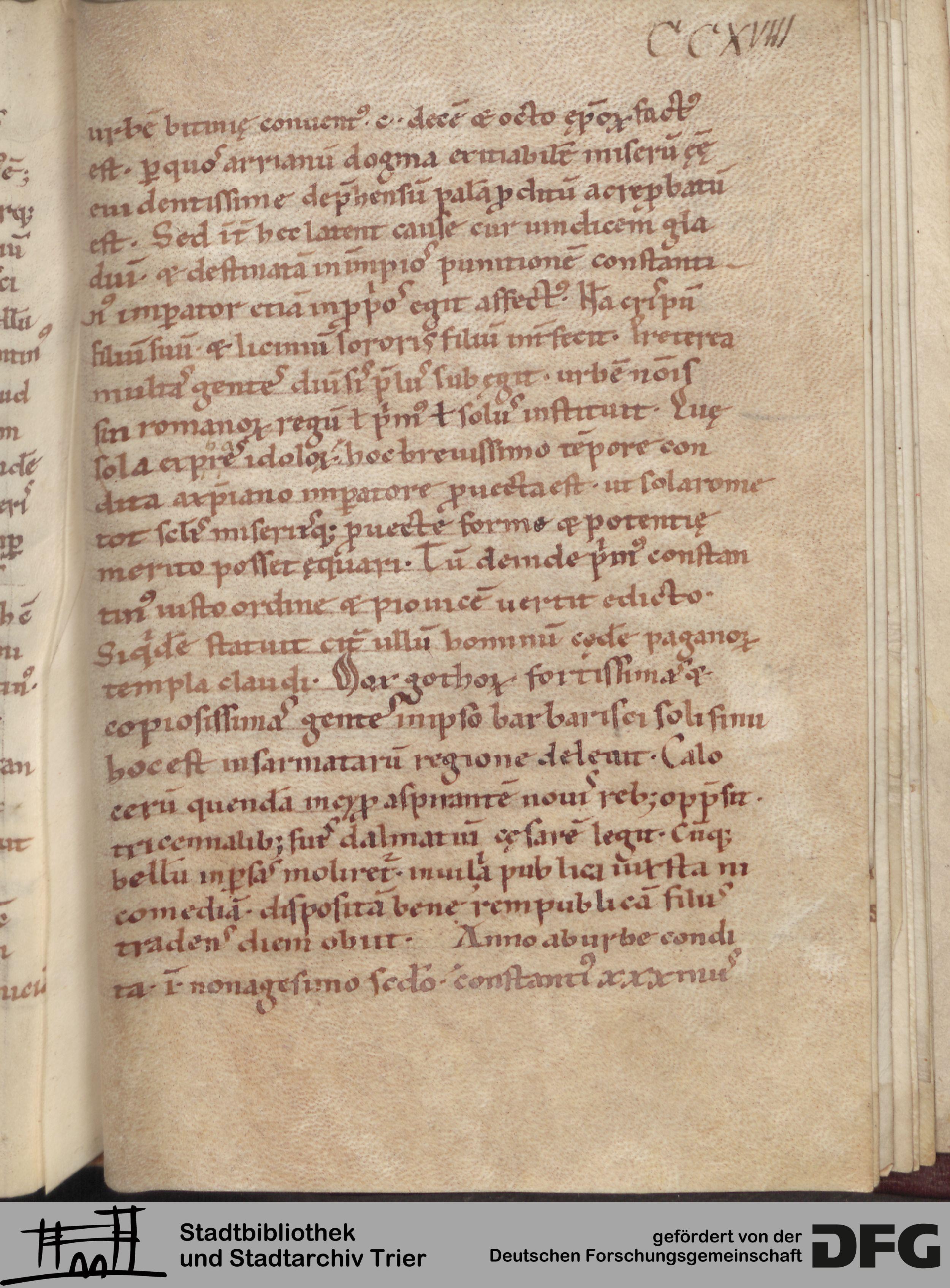 TextGrid Repository (2017). Stadtbibliothek und Stadtarchiv Trier, Hs. 1095/27 8°: Historiarum adversum paganos libri VII. Inhalte. Stadtbibliothek und Stadtarchiv Trier Hs. 1095/27 8°. Orosius, Historiarum adversum paganos libri VII. Blatt 218r. Blatt 218r. Virtuelles Skriptorium St. Matthias. Stadtbibliothek und Stadtarchiv Trier. https://hdl.handle.net/11378/0000-000A-6B4B-B